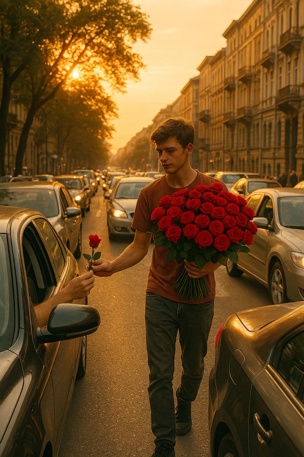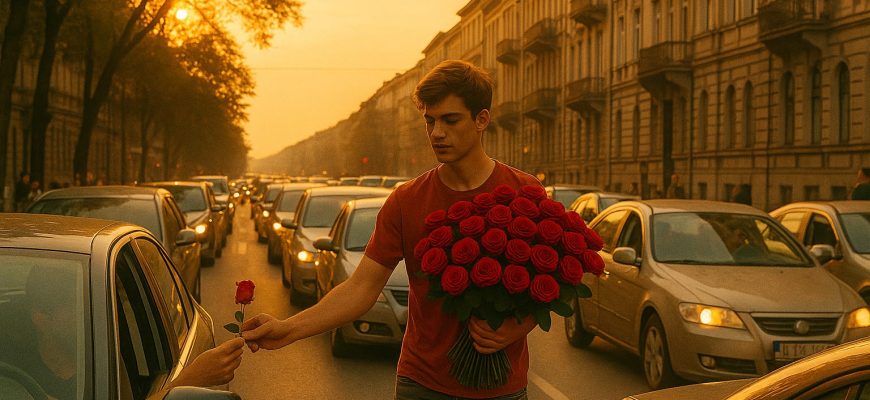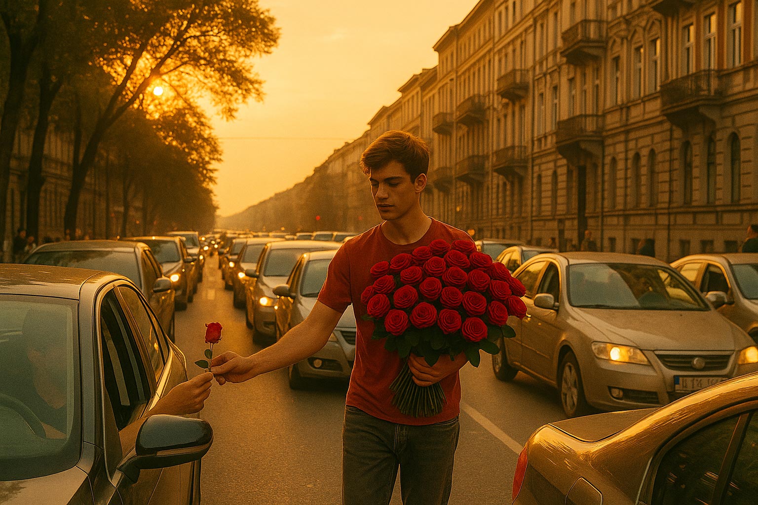 Тичаше между спрелите коли и подаваше рози на шофьорите.