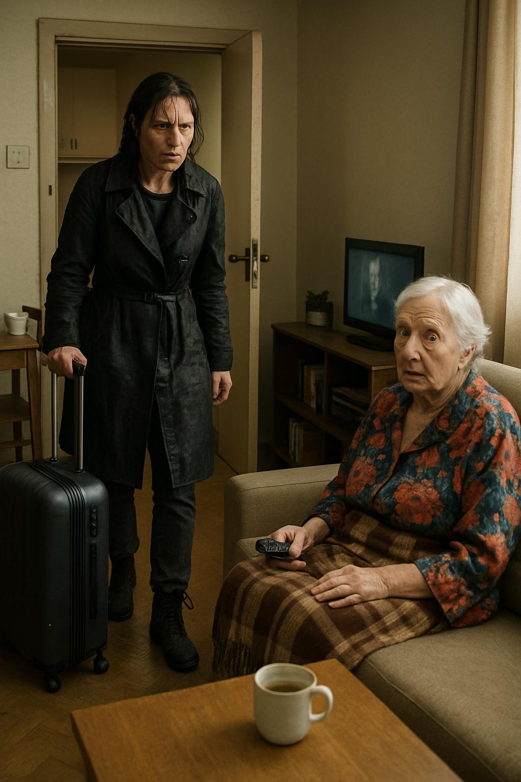 Това беше възрастна жена с шарен халат. Лицето ѝ грееше с доволна усмивка, а в ръцете държеше дистанционното за телевизора. В скута ѝ лежеше пледът — нейният плед за вечерите с книга.